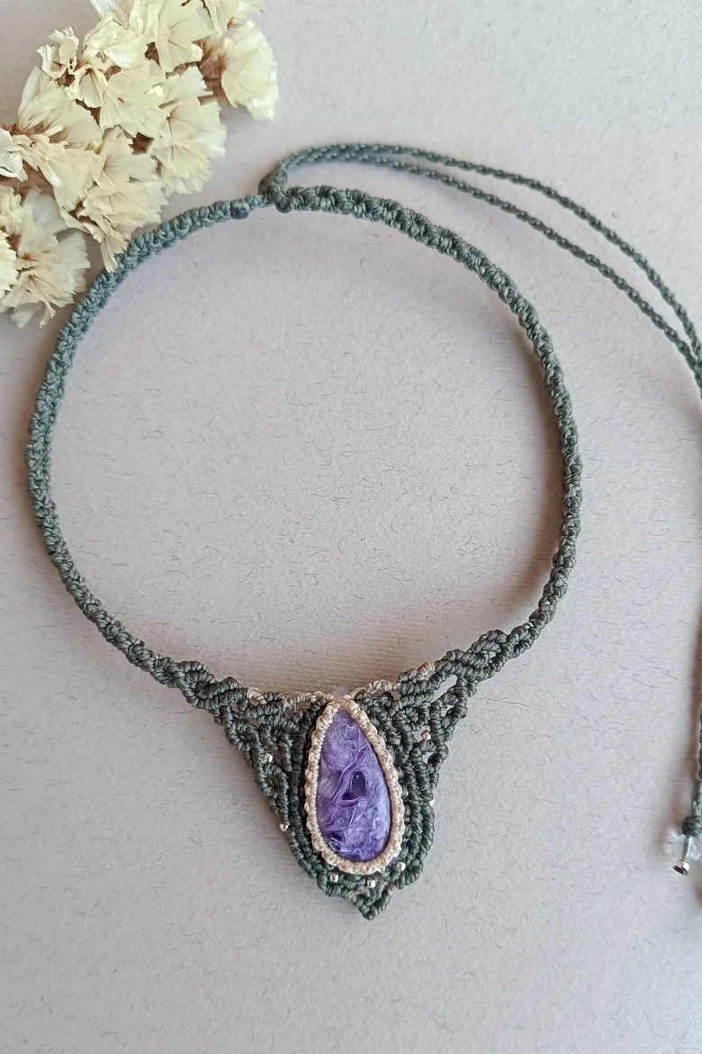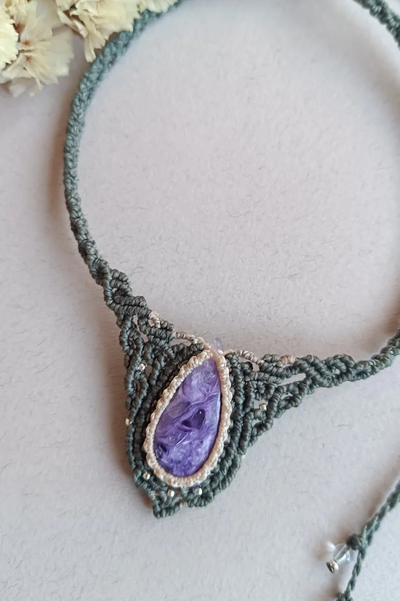 Charoite Necklace. Macrame. Materials: Poliester thread and Brass. Handmade with Love