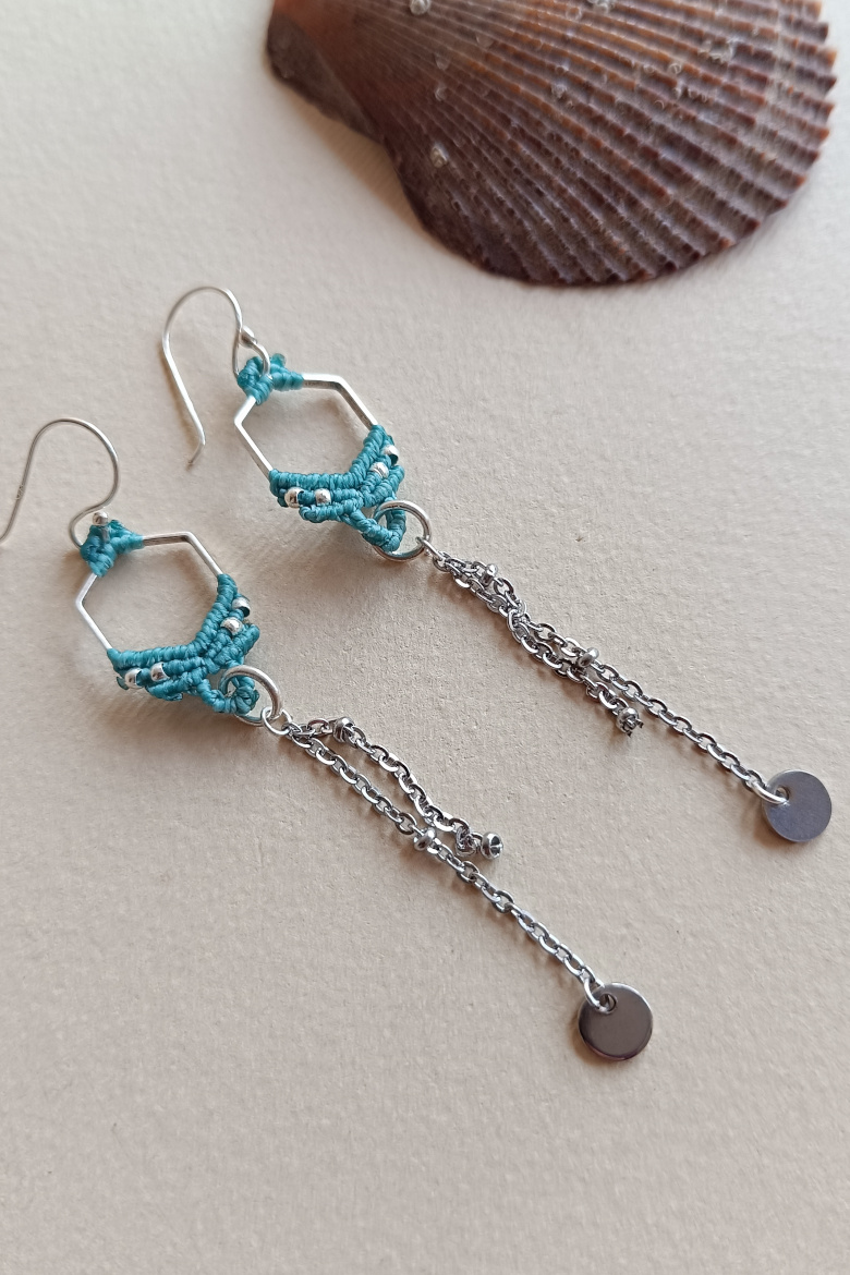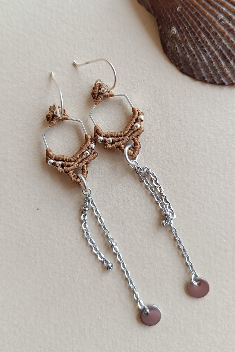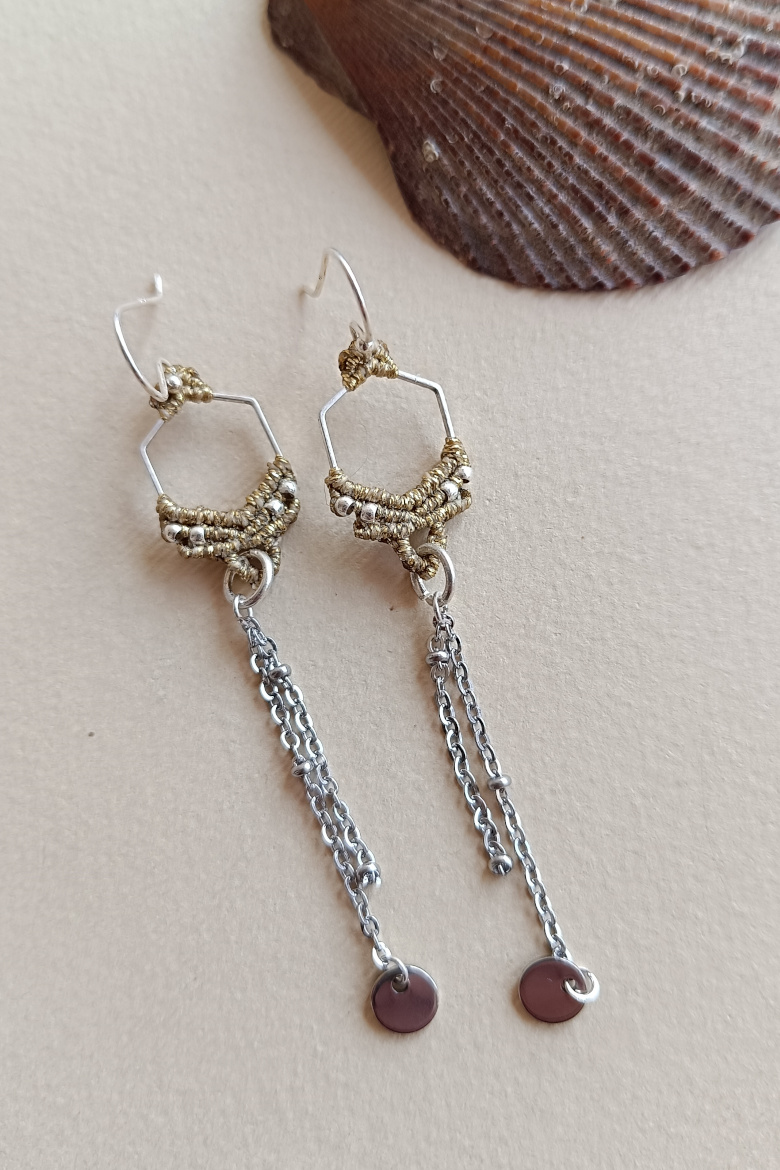 Estos pendientes de macramé tienen como pieza principal un hexágono de latón bañado en Plata de Ley 925. En su diseño le acompañan fornituras y cadena de latón y acero inoxidable bañadas en Plata de Ley 925, sin Nikel. Es una pieza muy cómoda, ligera y con mucho movimiento, te encantará llevarla!