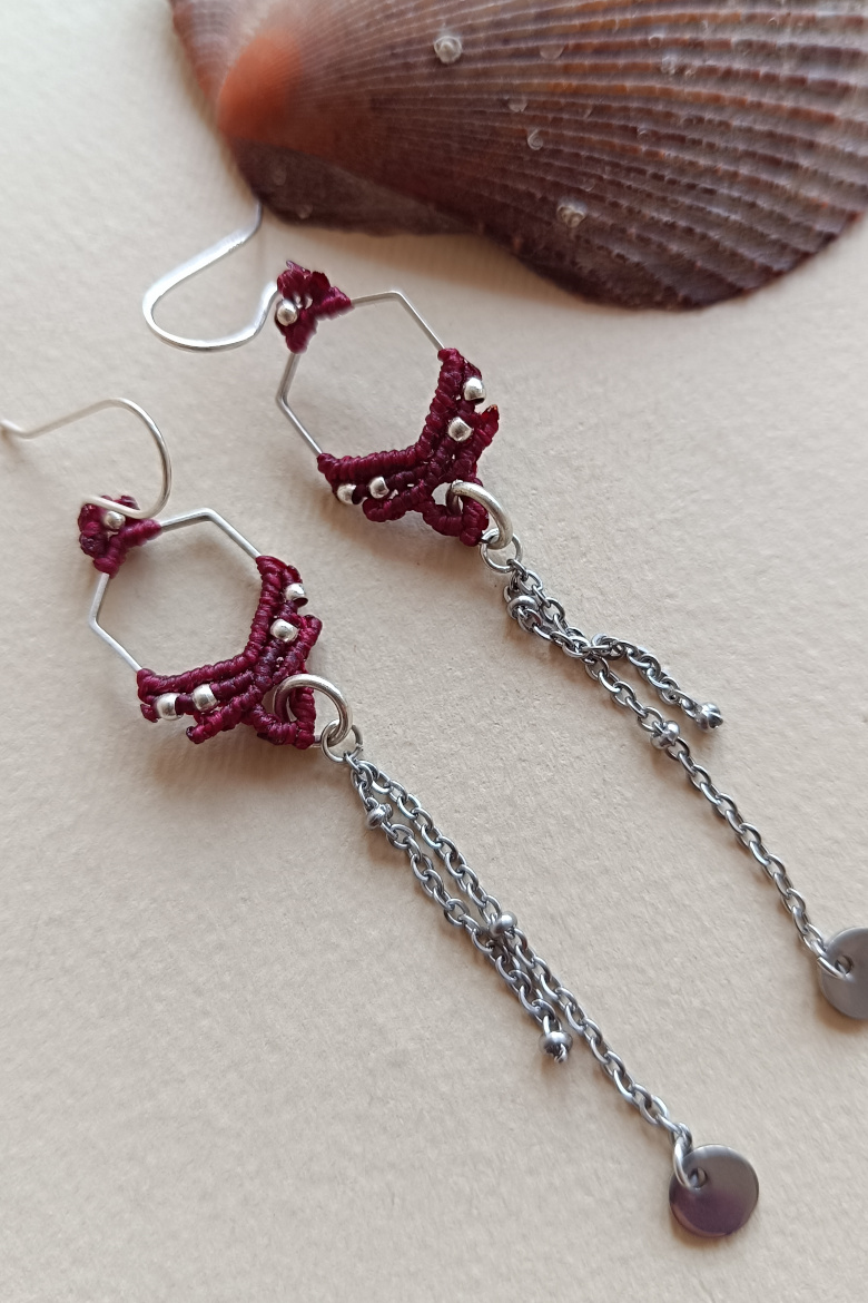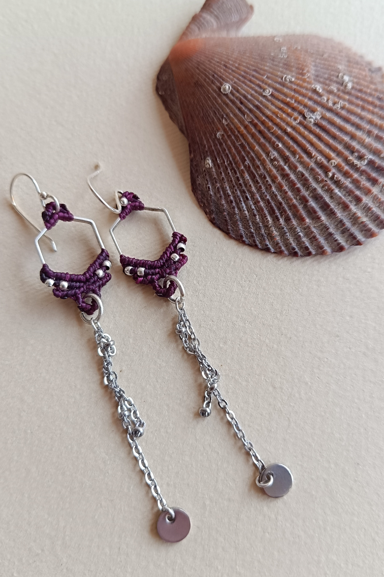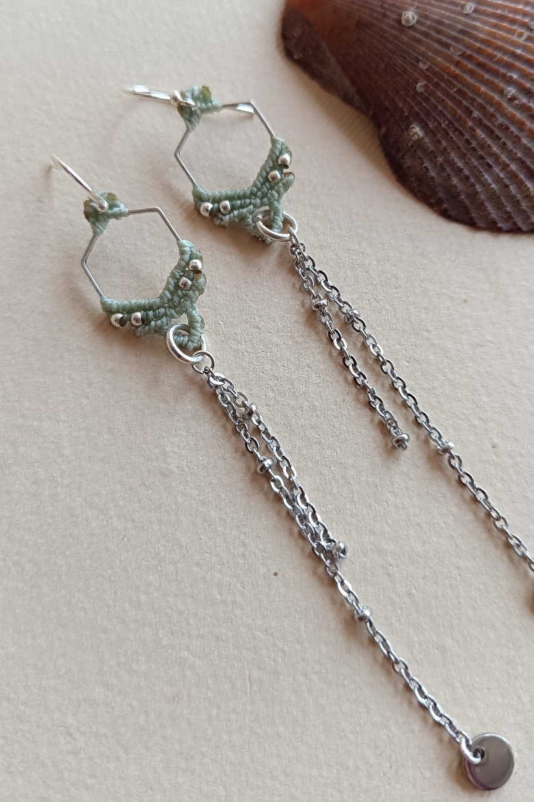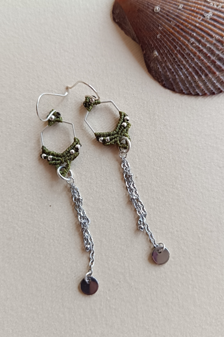 Estos pendientes de macramé tienen como pieza principal un hexágono de latón bañado en Plata de Ley 925. En su diseño le acompañan fornituras y cadena de latón y acero inoxidable bañadas en Plata de Ley 925, sin Nikel. Es una pieza muy cómoda, ligera y con mucho movimiento, te encantará llevarla!